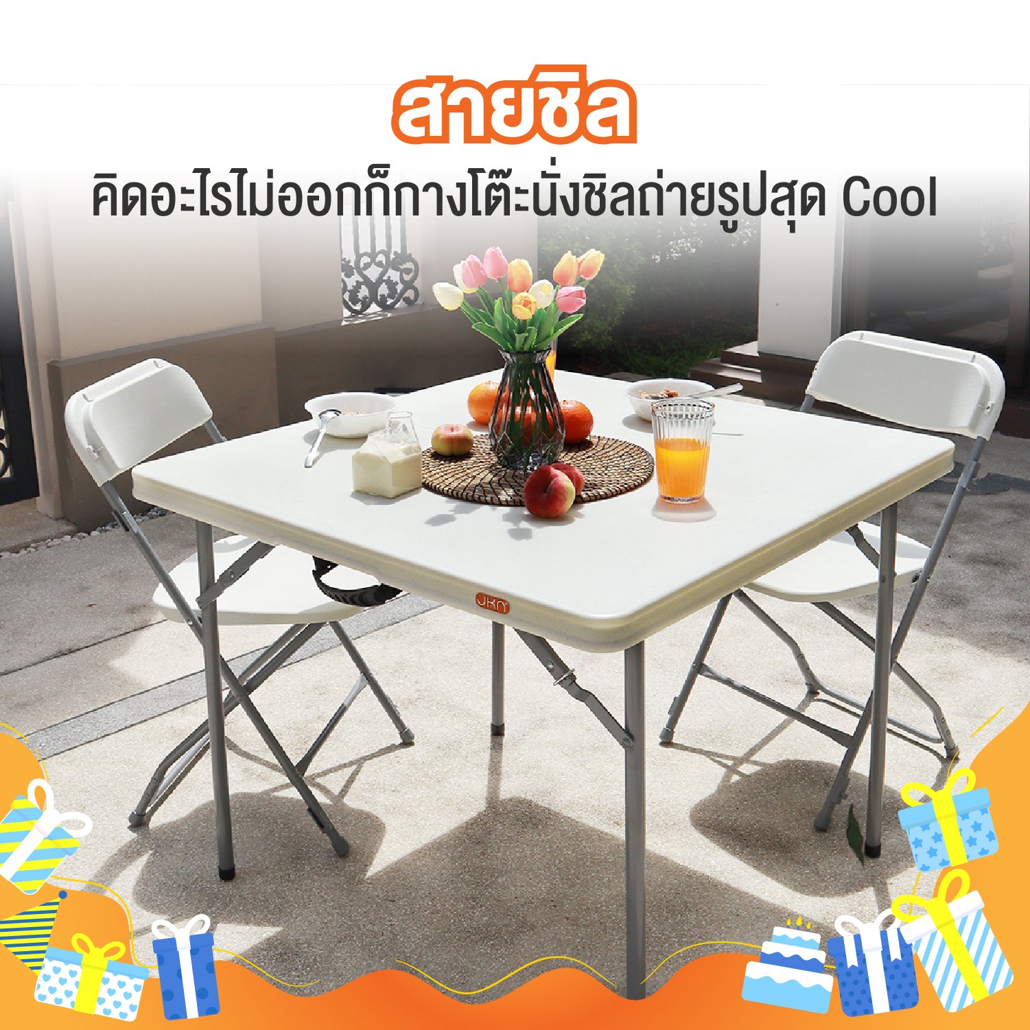 ถ้าเพื่อนยังมาไม่ครบ ก็จุดมุมชิว ๆ คูล ๆ ไว้ให้เพื่อนถ่ายรูปสวย ๆ รอเวลาก็ได้ แค่กางโต๊ะพับ ตั้งแล้วจัดจบในตัวเดียว เพิ่มมุมโปรดสำหรับสายชิล ได้สบาย