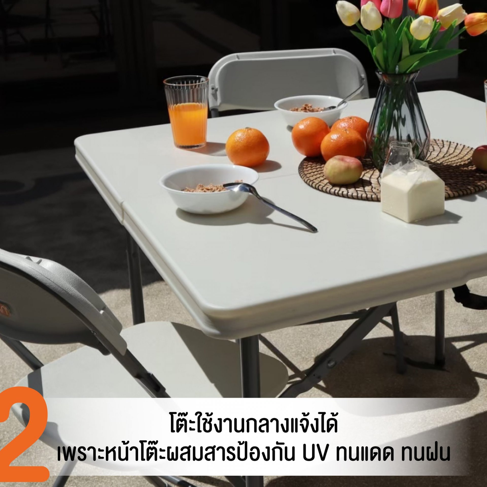 2. สามารถใช้งานโต๊ะกลางแจ้งได้ เพราะหน้าโต๊ะผสมสารป้องกัน UV ทนแดด ทนฝน