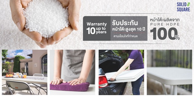 - โต๊ะพลาสติก จากร้าน Solid Square ใช้ พลาสติก Pure HDPE 100% ซึ่งมีคุณสมบัติที่เหนือกว่าโต๊ะพลาสติก HDPE ในท้องตลาดทั่วๆ ไป